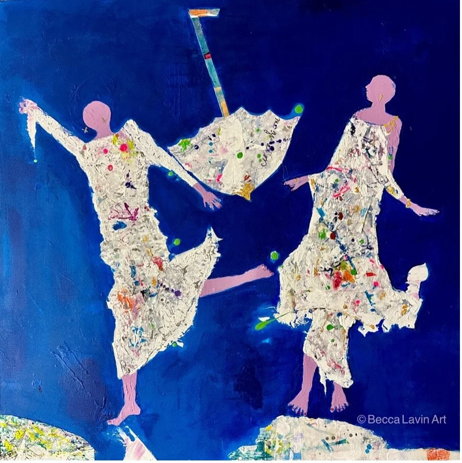 Dancing up the Storm came about in what was meant to be a ‘play’ session in my studio. One in which the artist (Moi) leaves everything worrisome or constraining behind with no one and no thing in mind. A literal stripping off of the straight jacket named ‘production’. The collage pieces are from torn pieces of protective paper on my art work station which I save after covered in my this and that’s, for projects like this. It just so happened, the umbrella shape was upside down. I thought “let it rain”. I LoVe getting wet and dancing in the rain rather than cowering to all the woe that demands we not only PAY for with our attentions but can get riled and helpless. I am fortunate to have great friends with sanity, action and empathy up their sleeves. I thought, “With Friends like these, who needs an umbrella? Ha!’ Voila! Dancing Up The Storm.